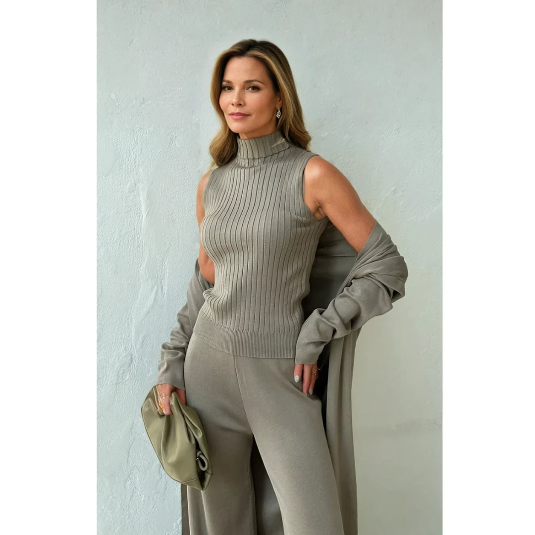 • Ensemble 3 pièces : Cardigan long, top sans manches côtelé, et pantalon taille élastique