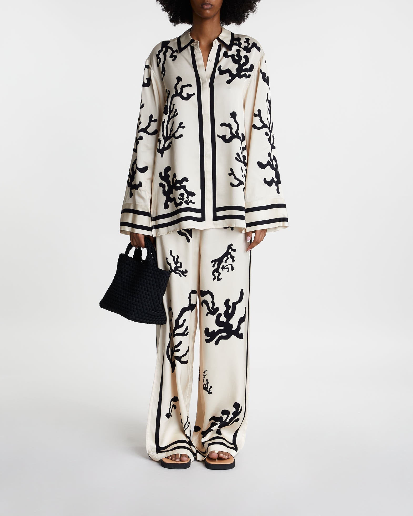 Cet ensemble fluide à imprimé graphique allie modernité et confort. Sa chemise boutonnée associée à un pantalon ample offre un look minimaliste mais affirmé.