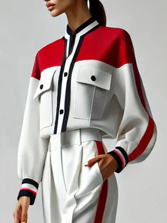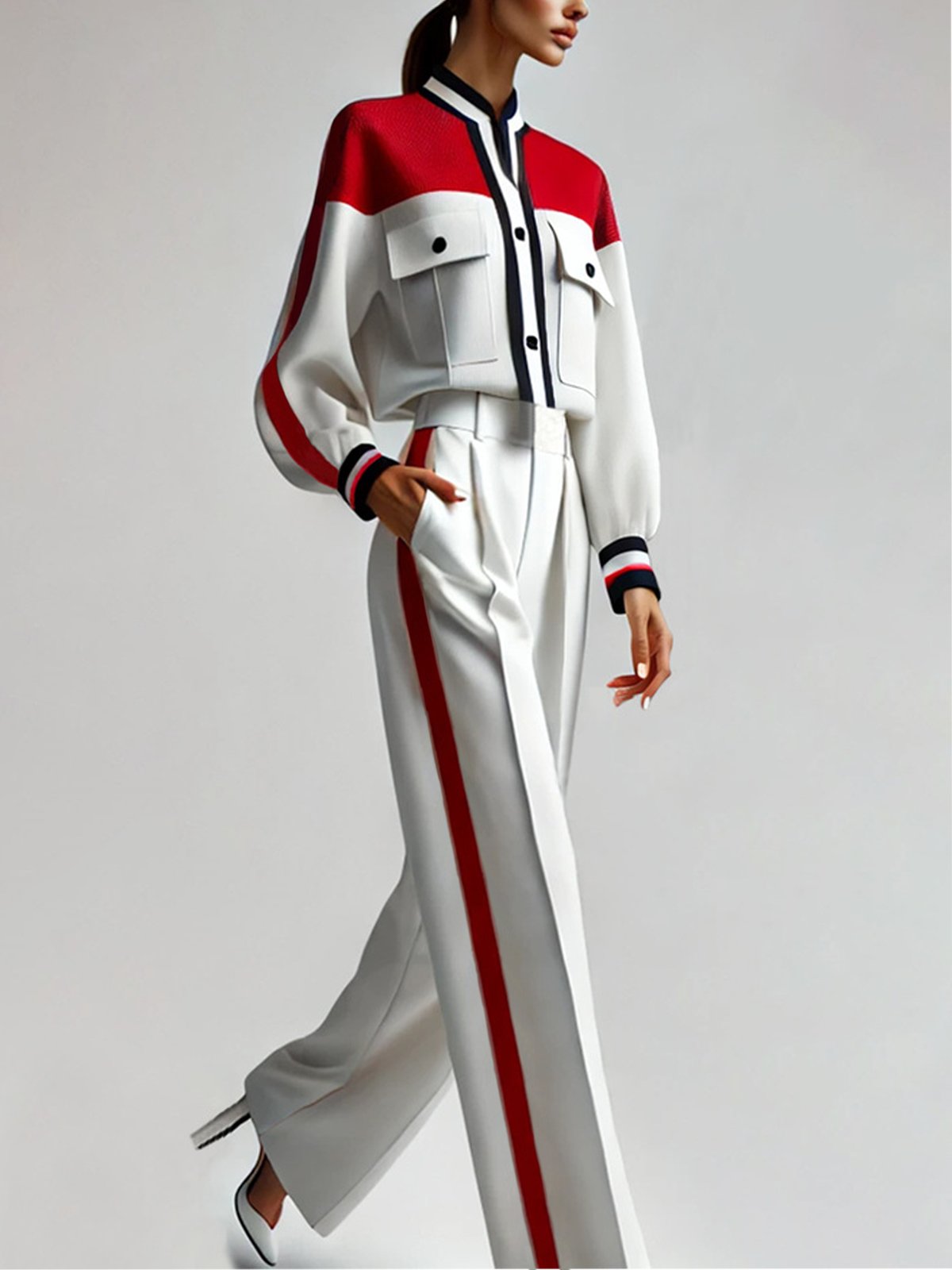 Cet ensemble bicolore à l’inspiration sport-chic revisite le tailleur avec modernité. Son pantalon large à bande contrastée allonge la silhouette, tandis que la veste courte à poches donne du caractère à votre allure.