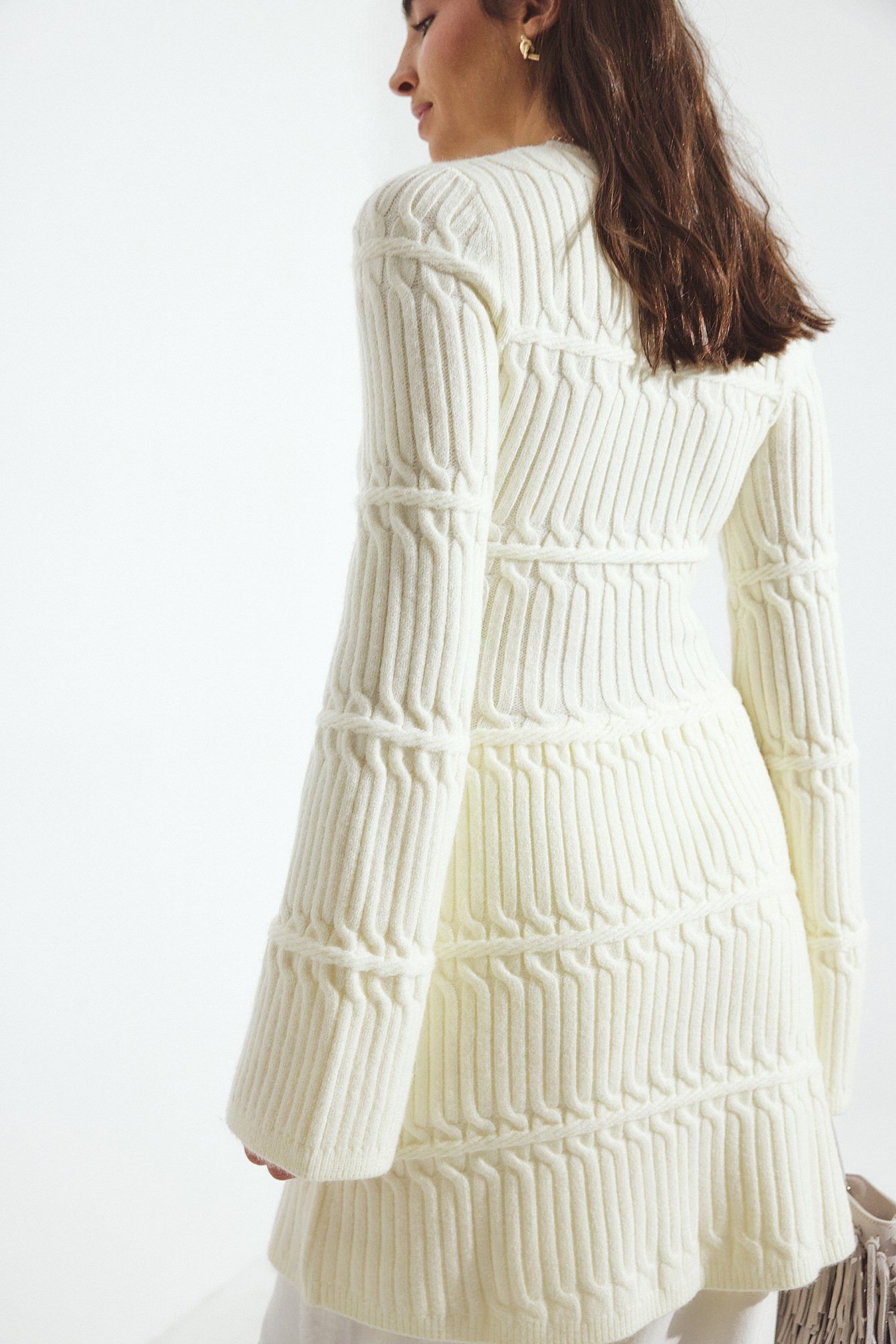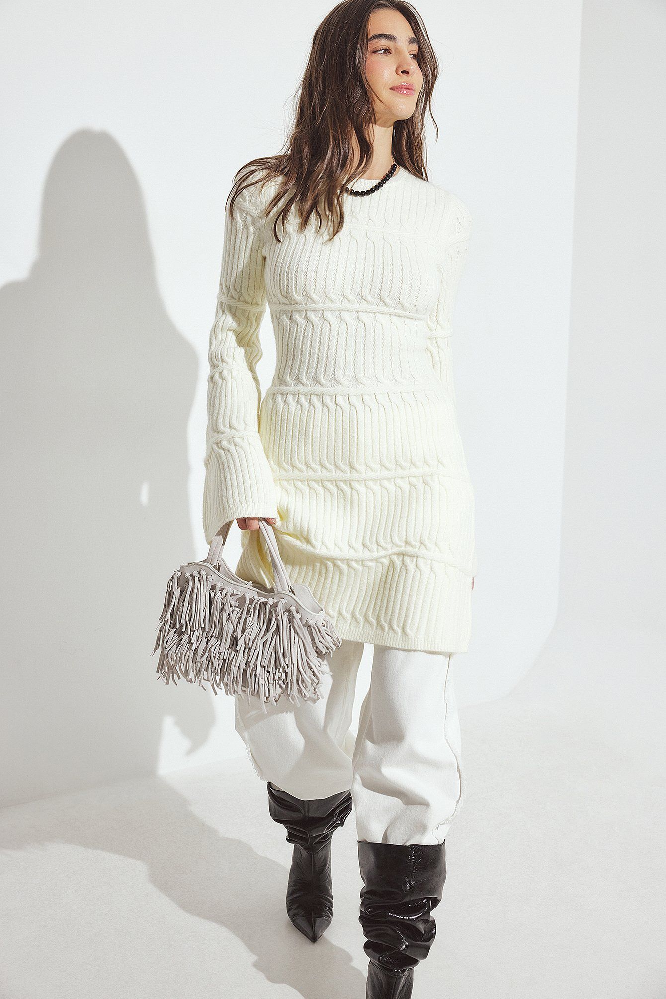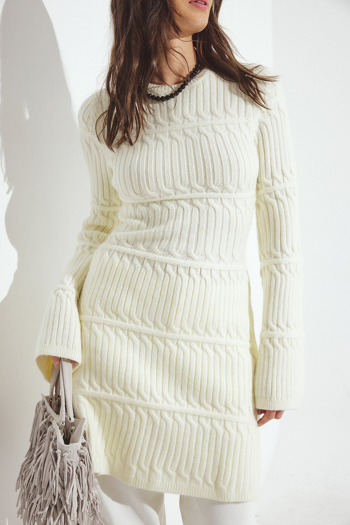 Elle présente une silhouette ajustée (fitted silhouette) qui met en valeur la forme du corps. La robe est dotée d'un col rond (round neckline) classique et de manches longues et larges (wide, long sleeves), créant un contraste stylisé avec la coupe ajustée du corps. La longueur mini est parfaite pour les bottes hautes ou les talons.